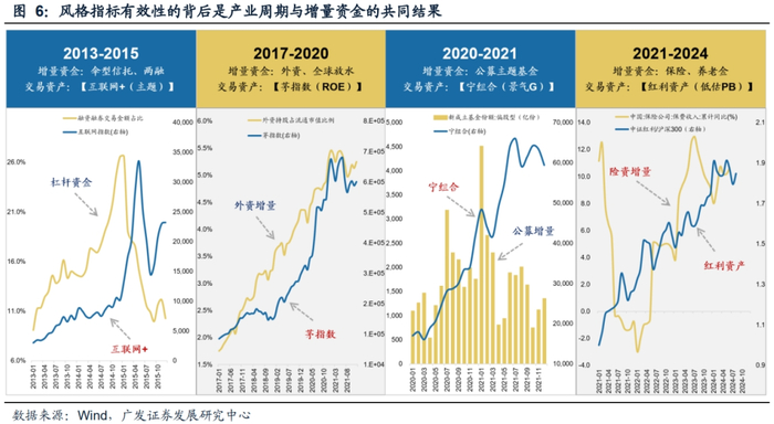 风格指标有效性的背后是产业周期与增量资金的共同结果。ROE选股特别有效的年份,比如17-20年,背景是外资增量资金的推动;PB选股特别有效的年份,比如22-24年,背景是险资边际增量资金的推动。
