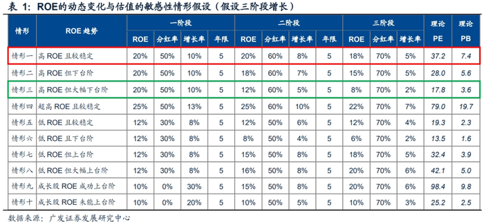 案例:以三阶段增长模型为例(一阶段高增、二阶段降速、三阶段永续),假设有一公司一阶段ROE为20%,二阶段ROE维持20%、三阶段永续增长,则理论PE为37.2倍、理论PB为7.4倍;若二阶段ROE降至12%,则理论PE为17.8倍、理论PB为3.6倍。