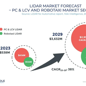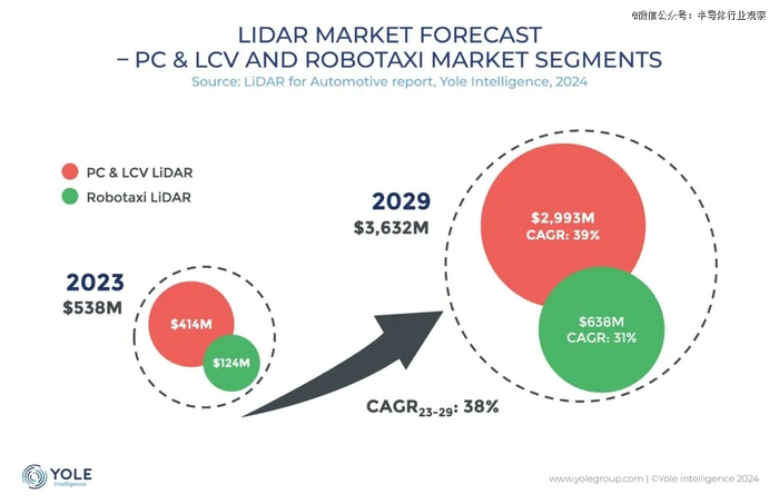 根据Yole Group最新发布的报告显示,随着自动驾驶技术的快速发展,NOA和AEB等功能的逐渐渗透,2023年全球汽车激光雷达市场规模为5.38亿美元,预计到2029年,全球汽车激光雷达市场将增长至36.32亿美元,2023年至2029年的年均复合增长率(CAGR)高达38%。
