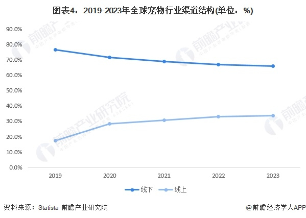 从宠物行业的销售渠道来看,线下渠道仍然是宠物行业最主要的销售渠道,2023年占比66.1%,但随着全球电子商务的稳定发展,线上渠道占比逐渐上升,2023年宠物行业线上渠道销售占比33.9%。
