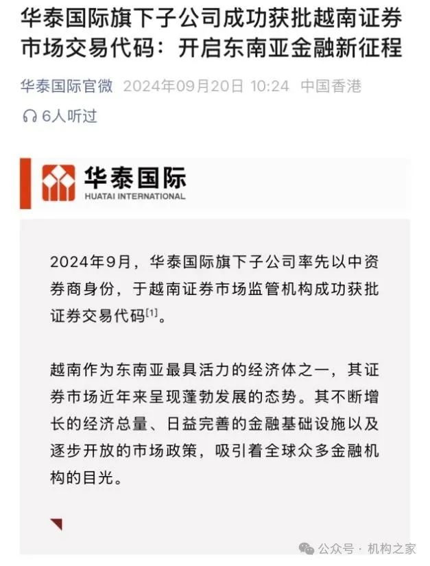 华泰国际官微发文称,旗下子公司于2024年9月率先以中资券商身份,于越南证券市场监管机构成功获批证券交易代码。