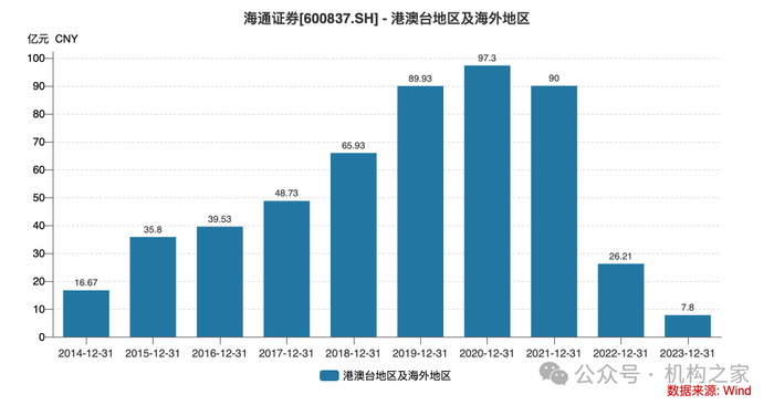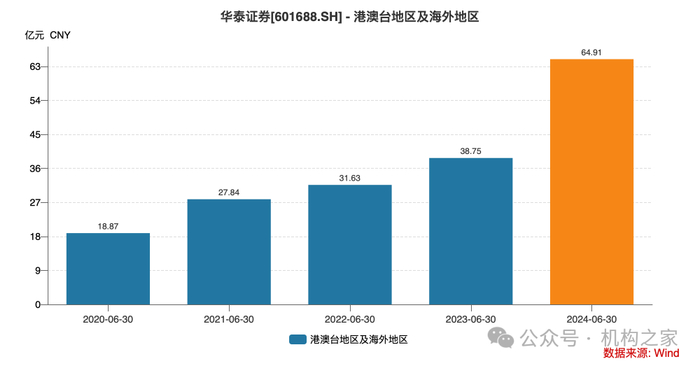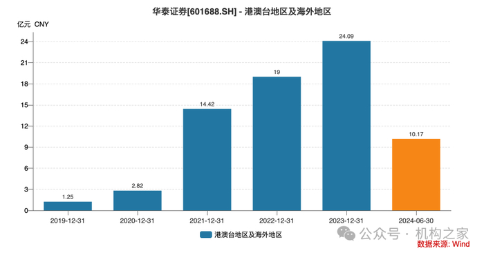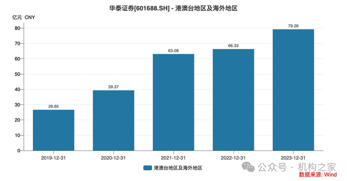 根据Wind数据,华泰证券来自港澳台地区及海外地区的收入近年来呈现快速增长态势。2019年,该项收入为26.65亿元,到2023年已经攀升至79.26亿元,期间复合增长率达31.32%。