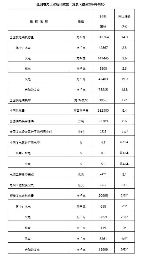 1-8月份,全国发电设备累计平均利用2328小时,比上年同期减少103小时。全国主要发电企业电源工程完成投资4976亿元,同比增长5.1%。电网工程完成投资3330亿元,同比增长23.1%。