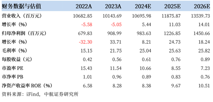 预计公司2024-26年实现营收106.96亿元/118.76亿元/135.40亿元,归母净利润9.84亿元/12.27亿元/14.51亿元,当前股价对应市盈率为10.7X/8.6X/7.2X,维持“买入”评级。