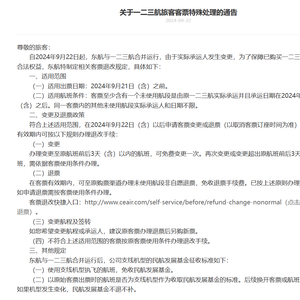 一二三航航班变更及退票政策同时发布。通告称,由于实际承运人发生变更,为了保障已购买一二三航航班旅客的合法权益,东航特制定相关客票退改规定。适用出票日期为2024年9月21日(含)之前。适用航班条件为客票至少含有一个未使用航段是由原一二三航实际承运并且承运日期在2024年9月22日(含)之后。同一客票内的其他未使用航段实际承运人和日期不限。