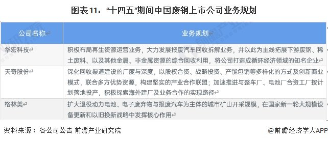 “十四五”时期,废钢绿色化、智能化发展已成为主要方向,各企业根据自身需求也制定了相关业务规划,以增加企业动能、提高市场竞争力。如华宏科技提出,大力发展报废汽车回收拆解业务,并以此为主线拓展下游废钢、稀土废料、以及其他金属、非金属资源的综合回收利用;格林美提出扩大退役动力电池、电子废弃物与报废汽车为主体的城市矿山开采规模。