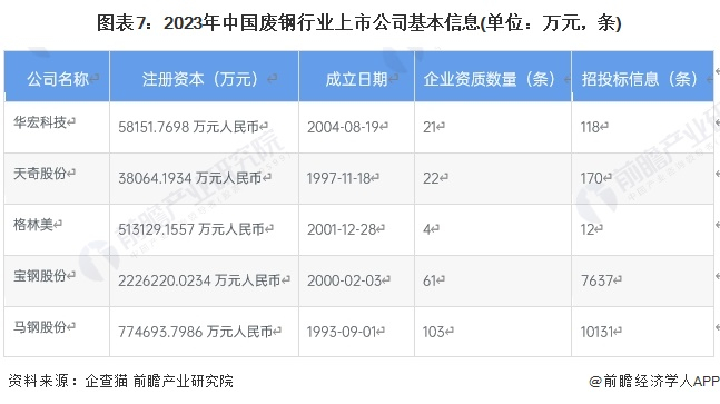 从废钢行业的上市企业布局和已有公开信息分析,注册资本最多的是宝钢股份,马钢股份招投标信息与资质数量最多,同时成立时间最早。