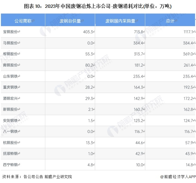 从各废钢冶炼企业废钢消耗量来看,2023年宝钢股份废钢冶炼量达1117.1万吨,其次为马钢股份,为384.4万吨。从废钢来源来看,各企业废钢主要来自国内采购。