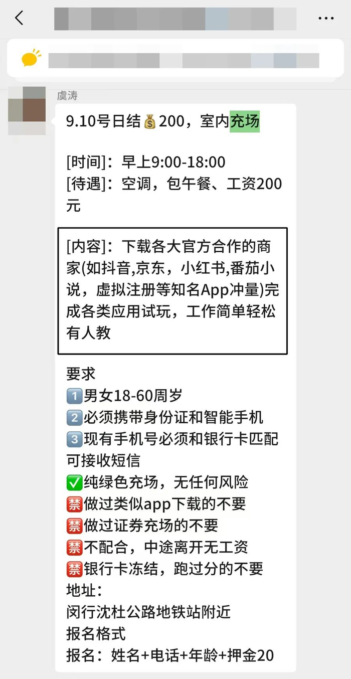 什么是“App充场”?循着李女士的线索,记者也加上了几名劳务中介的微信,他们会通过朋友圈发布各种“打零工”兼职信息,而“App充场”几乎是常驻项目。9月10日一早,劳务中介虞某发布了当天的“App充场”兼职信息,声称只要下载抖音、京东等知名App冲量即可,“工作简单轻松,有空调包午餐”,报酬是200元一天。记者支付押金报名后,被通知9月11日一早8时30分,在8号线沈杜公路站1号口集合。