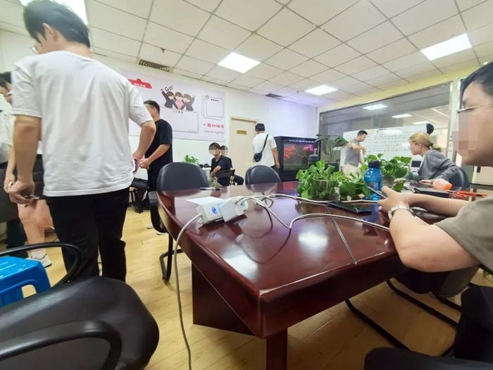 △227室外面没有任何标牌,推开玻璃门是一个大房间,连着几个小房间。大房间摆着一张大会议桌和大量的椅子,靠近门侧摆着的白板上面用记号笔写有“App推广工作室”字样。