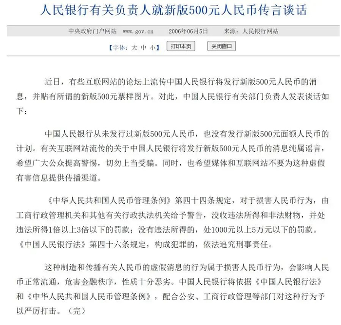 事实上,根据《中华人民共和国中国人民银行法》第十八条,中国人民银行发行新版人民币,应当将发行时间、面额、图案、式样、规格予以公告。然而,中国人民银行官方渠道没有发布过任何有关要发行新版人民币的公告。