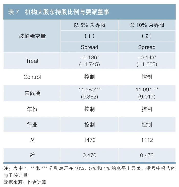 为了回答上述问题,本文参照蔡贵龙等(2018)的做法,根据非控股第一机构大股东持股比例是否超过5%以及机构投资者是否委派董事将上市公司样本划分为4组3,并构造变量Treat。具体来说,若上市公司的非控股第一机构大股东持股比例低于5%,但存在机构委派董事,则Treat取值为1;若上市公司的非控股第一机构大股东持股比例超过5%,但没有机构委派董事,则Treat取值为0。将变量Treat替代模型(1)中的原有解释变量Dire并重新进行回归,回归结果如表7的第(1)列所示,Treat前的回归系数显著为负,表明相对于机构大股东持股比例较高但无董事委派的上市公司,机构大股东持股比例较低但具有委派董事公司的债券融资成本更低,从而进一步说明了机构大股东通过委派董事参与公司治理,进而发挥股东积极主义的重要性。此外,基于上市公司的非控股第一机构大股东持股比例是否超过10%进行样本分组后的回归结果如表7的第(2)列所示,检验结果依然是证实了上述结论。