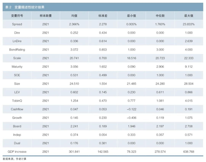 此外,借鉴已有文献,上述模型中还加入了描述债券特征、发行主体特征和地区宏观经济发展等问题的变量,并控制了年份和行业的固定效应。主要变量选择及其定义如表1所示。