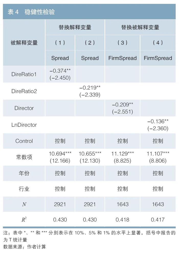 鉴于同一家公司可能发行多只债券,因此本文以债券发行规模占比(1只债券的发行额占该公司所有债券发行总额的比重)为权重对公司所有个券信用利差进行加权平均,由此得到公司层面的年度加权债券信用利差FirmSpread,替换原有被解释变量Spread,并基于模型(1)重新进行检验2。表4中后两列的实证结果表明,替换被解释变量后的检验结果也依然稳健。