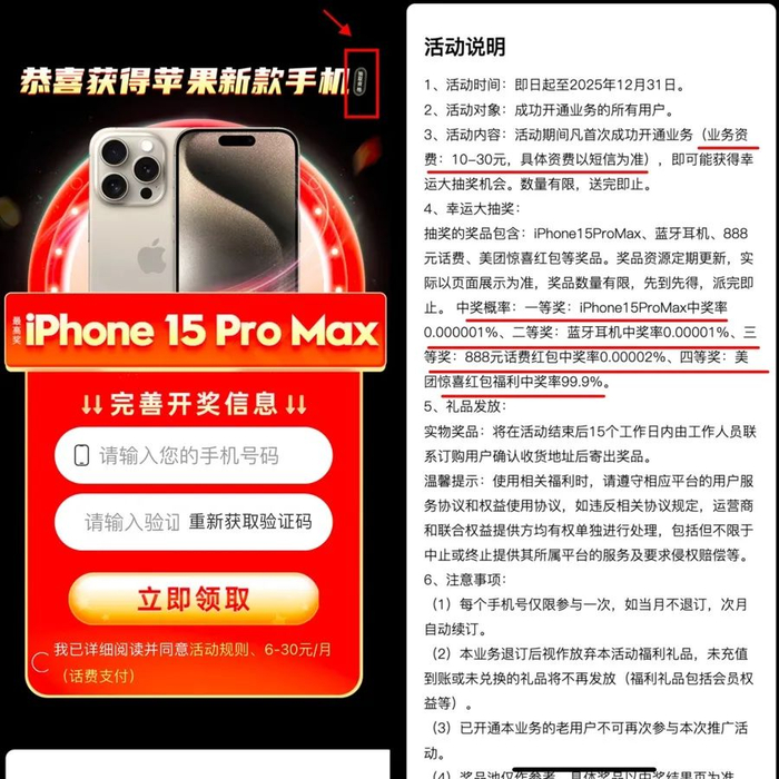 而记者多番核查抽奖页面才注意到,中奖结果的右上角标注着极其微小的字眼——“抽取资格”。下拉页面才能明确看到活动说明,用户抽奖获得的并非是iPhone手机,而只是进一步参与抽取新款手机的“抽奖资格”,实际抽中iPhone手机的概率只有0.000001%,且参与抽奖需先开通相关收费业务。记者输入手机号码后,收到一条来自号码“10655550”,以“中国联通”开头的短信,内容显示“您正在购买联通爱听悦学尊享会员25元/月-立即生效商品”。记者查询到爱听悦学尊享会员适用于“联通爱听”App,这是一款听书音频软件。看来,该“抽奖”活动与三大运营商均有业务合作。