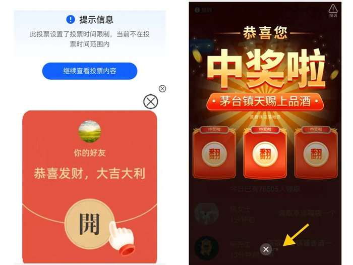 记者发现,该网络投票活动使用的是“易企秀”,在授权微信账号信息后,页面会跳转出一个红包界面。点击后,界面上滚动着用户“领取话费15元”“领取茅台镇酱香酒一箱”等活动奖品的信息,并提示“今日已有78530人”领取,且数字还在不断增加。点击开奖界面多次,记者都被通知“中奖”茅台镇贵州国酱酒。随机选择一个奖品详情发现中了12瓶。记者注意到在最底部“广告”两个字极为暗淡,无法直观看到。随后,网页跳转至确认订单界面,需要填写收件人姓名、手机号码、住址信息。