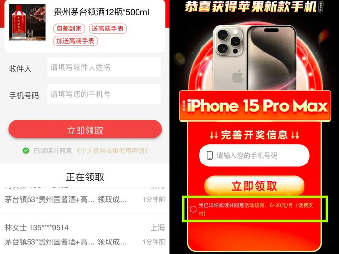 金先生使用的一家叫“诺诺网”开票平台,记者体验时发现,开票结果生成后大约6秒会自动跳转到“开票领红包”的抽奖界面,可点击8次抽奖,“中奖率”100%。8次尝试中,记者分别中了1次B站会员、2次茅台镇贵州王子酒、5次苹果手机。其中B站会员的奖品获取界面已被设置停止访问,原因是“经网址安全检测,该网页包含不安全内容”。所谓的苹果手机奖品,则需要用户在登记电话,随后系统自动会发送验证码并勾选“我已详细阅读并同意活动规则、隐私规则”,随后收费6-30元不等。