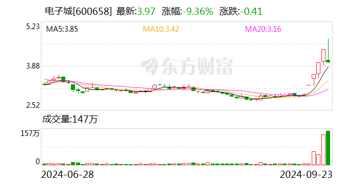 沪深交易所2024年09月23日公布的交易公开信息显示,电子城因成为当日价格振幅达到15%的证券、当日跌幅偏离值达7%的证券上榜。电子城当日收报3.97元,涨跌幅-9.36%,偏离值-9.8%,振幅19.04%,换手率13.10%,成交额6.08亿元。