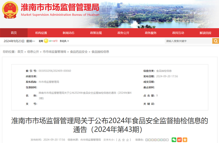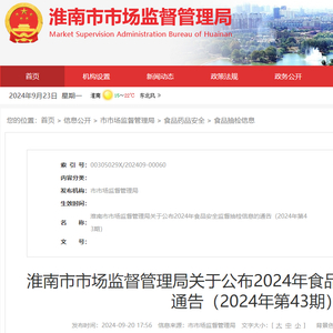 安徽省淮南市市场监督管理局关于公布2024年食品安全监督抽检信息的通告(2024年第43期)