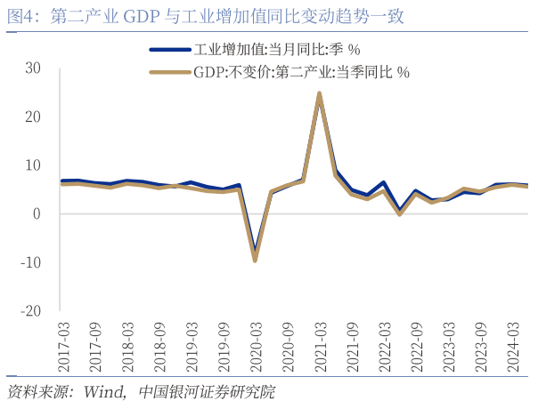 第二产业:工业增加值可作为衡量第二产业GDP的代理指标。从第二产业GDP构成来看,二产包括工业和建筑业,其中工业占第二产业增加值比重超过80%。从历史走势来看,工业增加值同比和第二产业GDP同比高度相关。