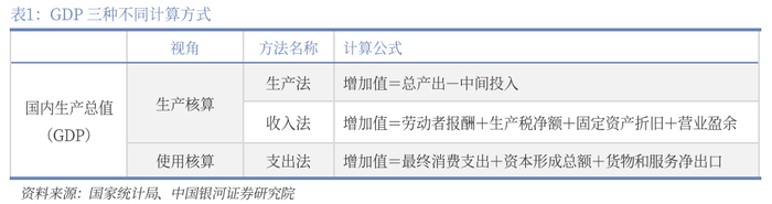 生产法是从生产过程中创造的货物和服务价值中,剔除生产过程中投入的中间货物和服务价值,得到增加值的一种方法;收入法是从生产过程形成收入的角度,对生产活动成果进行核算,按照这种计算方法,增加值由劳动者报酬、生产税净额、固定资产折旧和营业盈余四个部分组成。而国际上更加通行的核算方式为“使用核算”,即支出法GDP,是从生产活动成果最终使用的角度计算国内生产总值的一种方法。最终使用包括最终消费支出、资本形成总额及货物和服务净出口三部分,也就是我们经常提到的“三驾马车”。