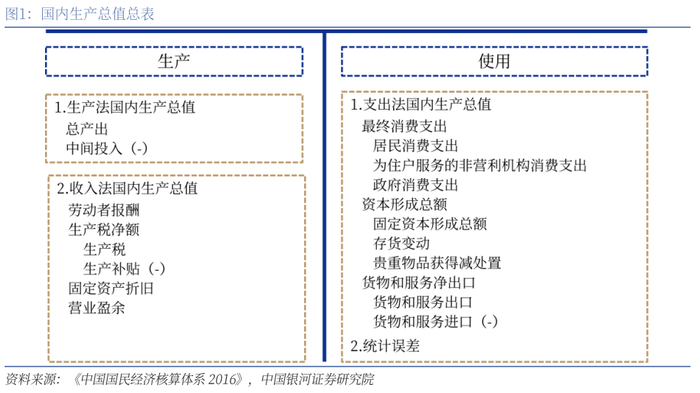 根据《中国国民经济核算体系2016》,国内生产总值总表的左端为生产方,体现为GDP核算的生产法和收入法,表的右端为使用方,体现为GDP核算的支出法。我国官方GDP统计为生产核算,是生产法和收入法混合计算的结果,一般称为生产法GDP或GDP,而按支出法计算的GDP与生产法GDP可能存在差异,两者之间的差额为统计误差。