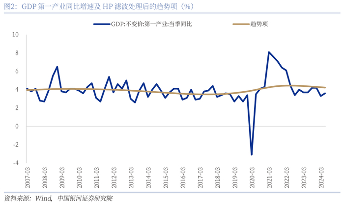 第一产业:增速稳定在4%左右的水平。第一产业包括农业(包括林业、牧业、渔业等),其GDP增速常年以来保持稳定,基本维持在4%的水平左右,通过使用HP滤波法,可以看到第一产业GDP的同比增速中枢近年来基本稳定于4.2%的水平。