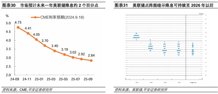 10年美债利率有可能在首次降息后1-2个月内阶段反弹,之后继续下行。在本轮降息前,10年美债利率已有所下行,但幅度仍属于历史中位数水平(图表24)。展望后市,如果美联储兑现降息后,经济数据保持韧性,市场衰退担忧缓和、降息预期减弱,可能令美债利率阶段触底回升。再往后,由于本轮降息的空间较大,目前CME利率期货市场预计未来一年美联储将累计降息约2个百分点,美联储最新点阵图暗示降息周期至少延续至2026年。如果美联储保持降息,那么美债利率可能继续下行。