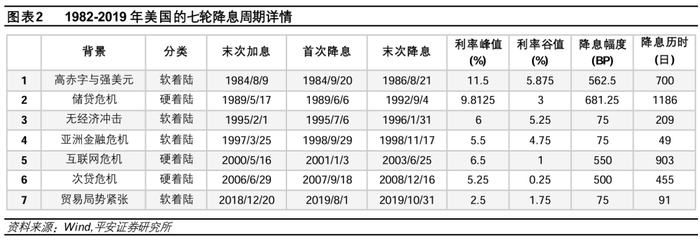 我们选取的7轮降息周期,起点均是加息以后的首次降息(不考虑降息暂停后再降息的情况)。2019年开始的降息周期有意排除了2020年因疫情冲击引发的降息,尽量确保所选取的降息周期都具有“内生性”,对当下有较强的启示意义。