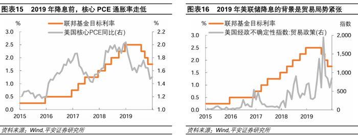 2019年,美联储降息的背景是,经济和就业市场稳健,但通胀率低于2%,且贸易局势紧张。2019上半年,美国实际GDP环比折年率录得2.2-3.4%,制造业PMI保持扩张但呈下降趋势,并于8月跌入萎缩区间;失业率从年初4%下降至5-6月的3.6%;PCE通胀率保持1.4-1.6%,核心PCE通胀率由年初1.9%下降至3-5月的1.6%。