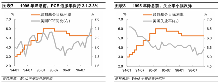 1995年,美联储降息的背景是,美国经济增长出现放缓,实际GDP环比折年率在上半年仅录得1.2-1.4%,低于1994年平均4%以上的水平;失业率曾经在4月由5.4%短暂上升至5.8%、此后回落至5.6-5.7%,制造业PMI在5-6月跌入萎缩区间;PCE通胀率在上半年保持2.1-2.3%。里士满联储的文章指出[2],1995年美联储降息的决定并非“迫在眉睫”,因为没有看到经济衰退和失业率大幅上升。因此,这一轮利率周期也被视为“软着陆”的典型案例。另一方面,美联储的操作成功避免了通胀“起飞”,在降息过程中PCE通胀率几乎没有超过2.3%,保持了相对稳定。