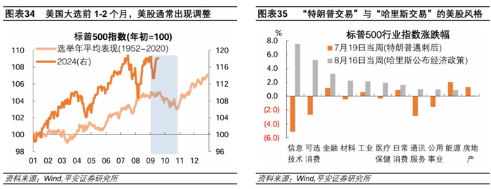 美股风格需结合降息预期和大选选情综合判断。大选方面,“特朗普交易”可能相对利好传统能源、房地产、金融、工业等板块,“哈里斯交易”可能相对利好信息技术、可选消费等板块(参考报告《哈里斯:竞选优势、政策雏形与交易线索》)。例如,9月10日特朗普与哈里斯的首次辩论后,哈里斯表现较优,9月11日开盘后的科技股表现好于周期股。