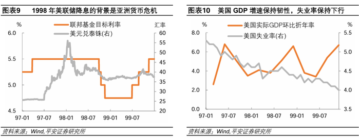 据降息当日的CNN报道[3],本次降息前,全球市场已经对美联储降息高度期待;降息后,美股下跌,因部分投资者认为美联储降息幅度过于保守。但事后来看,美国经济并未明显受到冲击,1998下半年实际GDP环比折年率高达5.1-6.6%,美联储在1999年3月上修经济前景,并于6月重启加息。美联储官员事后表示,1998年的降息反应过度,未能意识到美国经济有多么强劲,尽管时任美联储主席格林斯潘并不后悔降息,并认为当时的经济风险比通胀风险更具威胁[4]。