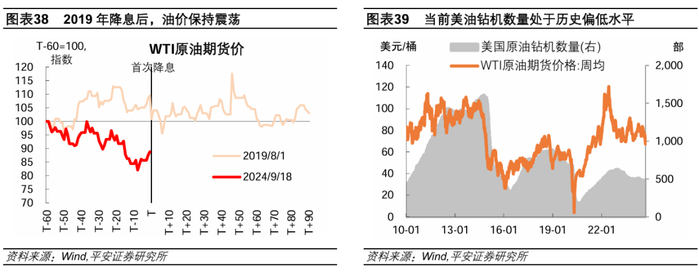 原油价格较可能在降息后保持震荡。历次降息后,由于经济仍在走弱,油价下跌的概率较大。但需注意,2010年美国页岩油革命以后,美国原油的产量上升且油企业也能更加灵活地调控产量,国际油价的定价与需求的相关性减弱。页岩油革命后,仅有一轮降息周期,即2019年,彼时WTI油价在降息前后保持震荡,并未明显下行。本轮降息前,油价在需求担忧中已经出现一定调整,限制了进一步下行的空间。展望后市,需求担忧对油价的冲击可能减弱,如果美国油企或欧佩克+等产油国适当减产,油价较有可能保持在近期水平震荡。