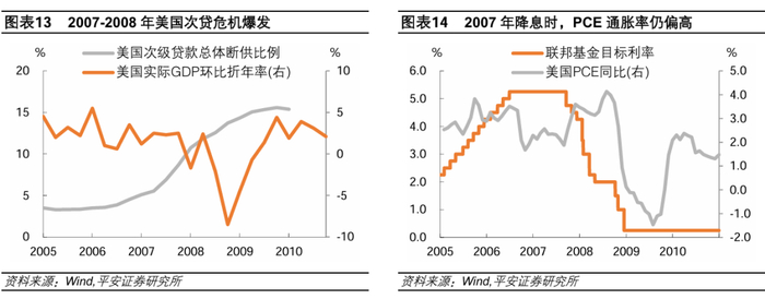 2007年,美国次贷危机逐渐发酵,8月法巴银行“暴雷”影响较大,成为本轮危机开始的关键节点[5]。8月17日,美联储宣布下调贴现率50BP至5.75%,但并未下调联邦基金目标利率;市场反应积极、股市上涨,多数投资者认为“形势可控”;市场预计美联储将于9月降息25BP,相对激进的预期是年内降息3次、每次25BP,也有批评者担忧降息会助长通胀[6]。9月18日,美联储下调联邦基金目标利率50BP至4.75%,声明称,金融市场的发展增加了经济前景的不确定性,信贷条件收紧可能加剧地产调整,今天的行动旨在防止金融市场混乱并促进长期温和增长。此外,声明也指出一些通胀风险仍然存在,美联储将对此密切关注。