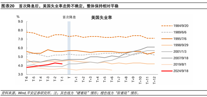 首次降息后,美国失业率走势不确定,但“萨姆指数”[9](失业率的3个月移动平均值与前12个月的3个月滚动移动平均值最低点之差)通常在降息后的6个月里上升,暗示就业市场边际压力持续加大;失业率在“硬着陆”情形中较有可能上行,且首次降息6个月后可能加快上行。