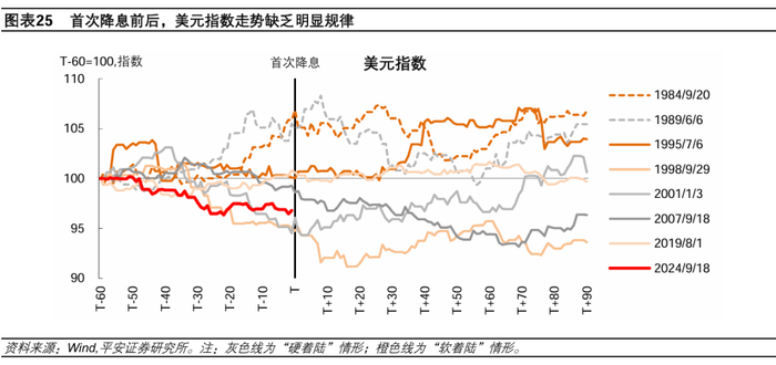美元指数的走势与降息、以及是否“软着陆”之间没有绝对的关联。在7轮周期中,降息后1-3个月内,美元指数上涨和下跌的概率基本持平。在3次“硬着陆”中,美元指数有较大概率在降息前后阶段走弱,但2次出现了在降息后3个月反超降息前2个月的情况。在4次“软着陆”中,有3次都出现美元指数在降息前后走平或反弹的情况。