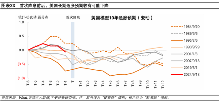 在“硬着陆”和“软着陆”两类情形下,核心PCE走势没有明显区别,均可能呈现韧性;模型通胀预期走势也没有呈现明显区别,在首次降息后都出现了不同程度的下行。此外,通胀绝对水平高低,与是否“软着陆”也不存在明显相关性。