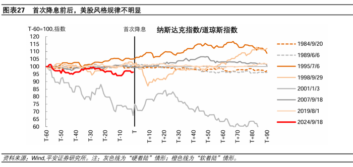 美股涨势可能在首次降息前后阶段“熄火”,但降息2-3个月后通常恢复上涨。在7轮周期中,首次降息前后,美股(标普500指数)在全部4次“软着陆”和1次“硬着陆”情形中保持了上涨趋势。从节奏上看,在首次降息前后1个月,美股通常出现波动调整,原因可能是,市场对于经济和政策前景的判断出现分歧。但是,除非出现“硬着陆”,美股在首次降息后3个月通常已经恢复上涨,标普500指数较首次降息前一日平均上涨2.8%。