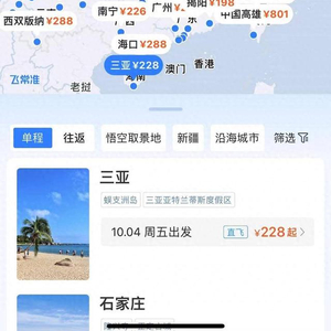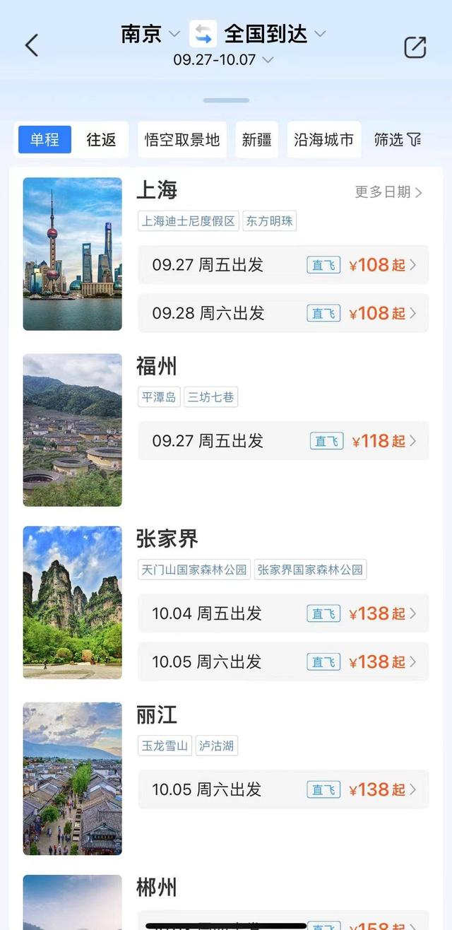 9月23日,在一出行平台上记者看到,出行时间在9月30日到10月7日之间,不含机建燃油费,南京飞往张家界的价格最低为四川航空的118元,南京直飞丽江最低为200元,以及前往重庆、桂林、三亚、深圳、呼和浩特、银川等热门城市也有许多两三百元的特价票。不过记者查询发现,这些热门目的地这些特价票多集中在10月3日至5日,在假期前两日的出行高峰很多都维持在千元左右,看来错峰出行光在交通费上就能省下一笔不少的开销。