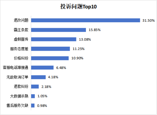 据消费保数据显示,飞猪的投诉主要集中在退改问题、霸王条款、虚假宣传、服务态度差等方面。其中,退改问题以 31.50% 的占比位居榜首,霸王条款占比为 15.85%,排第二。