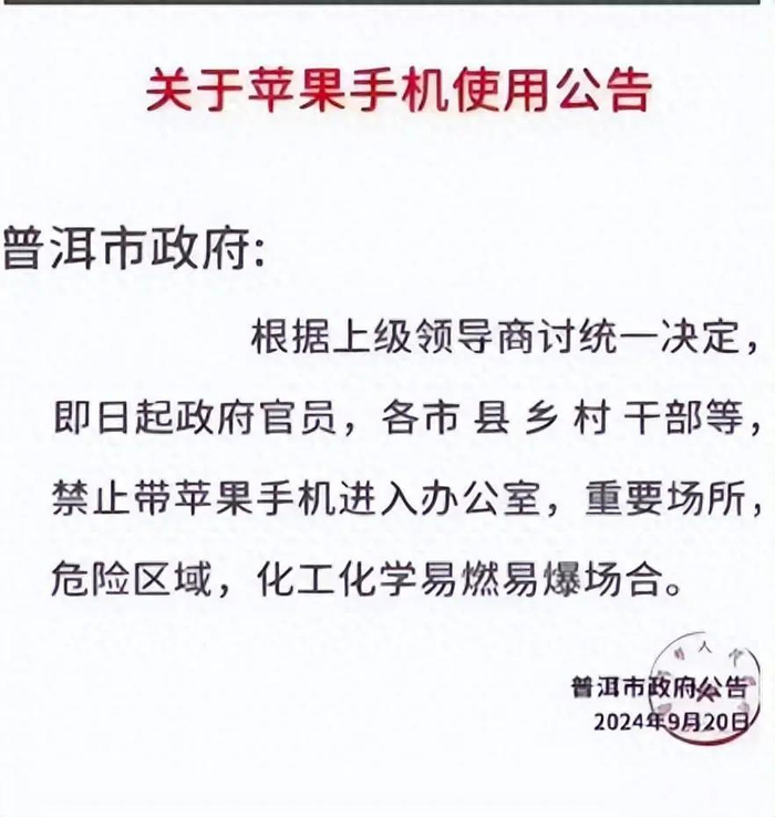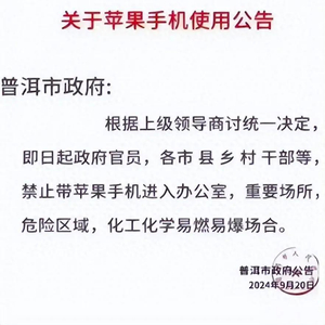 9月23日,一则“关于苹果手机使用公告”在网上引发关注。公告抬头为“普洱市政府”,正文为:根据上级领导商讨统一决定,即日起政府官员,各市、县、乡、村干部等,禁止带苹果手机进入办公室,重要场所,危险区域,化工化学易燃易爆场合。