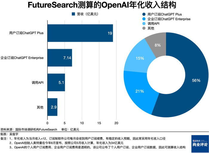 国际市场调研机构FutureSearch最新研究报告根据OpenAI公布的年化收入、付费用户结构测算了这家公司的收入结构——1000万个人订阅用户带来了19亿美元收入,占比56%;100万企业订阅用户带来了7.1亿美元收入,占比21%;API调用带来了5.1亿美元收入,占比15%。