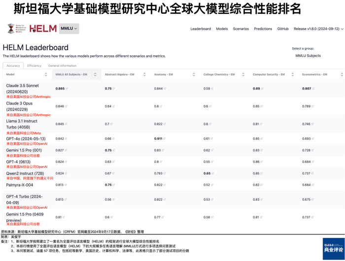 斯坦福大学基础模型研究中心(CRFM)长期进行全球大模型测试排名。截至9月17日的大规模多任务语言理解 (MMLU)测试排名显示,排名前十的模型厂商包括AI创业公司Anthropic(亚马逊投资)旗下的Claude 3.5系列、Meta旗下的Llama3.1系列、OpenAI(微软投资)旗下的GPT-4系列、谷歌旗下的Gemini 1.5系列。中国大模型目前仅有阿里旗下的通义千问2 Instruct (72B)进入了前十。