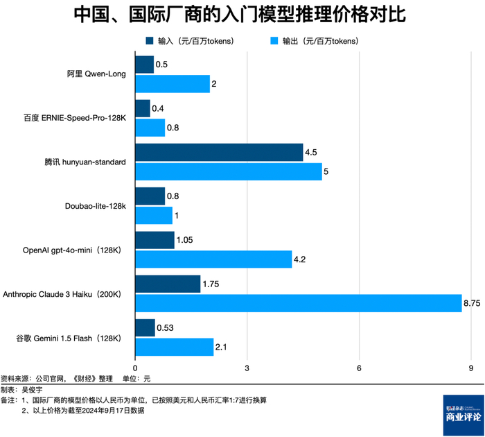 以阿里的Qwen-Long、百度的ERNIE-Speed-Pro-128K、腾讯的hunyuan-embedding三款入门模型为例,三者每百万Tokens的输出价格分别是2元、0.8元、5元。OpenAI的廉价模型OpenAI gpt-4o-mini百万Tokens输出价格是4.2元(OpenAI官网标价是0.6美元,此处已按美元和人民币汇率1:7换算)。阿里和百度的入门模型仅为OpenAI入门模型价格的48%和19%。