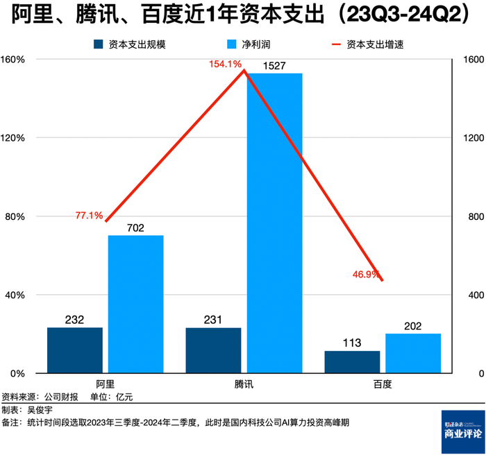 发展大模型需要采购芯片和服务器,租赁土地建设数据中心。这部分投入每年甚至高达百亿元。这些成本会体现在科技公司的资本支出中。微软2024财年四季度财报电话会披露,当月190亿美元资本支出几乎全部用于算力投入。近一年(2023年三季度-2024年二季度),阿里、腾讯、百度的资本支出分别高达232亿元、231亿元、113亿元,分别增长了77.1%、154.1%、46.9%,均是算力投资带动的结果。
