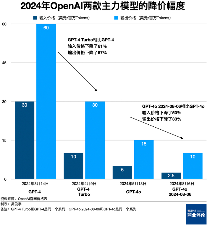 OpenAI今年三款模型GPT-4、GPT-4Turbo、GPT-4o就是沿着这种思路发展演进的。GPT-4o的模型参数比GPT-4更小,但可以精准解决大部分日常问题。GPT-4 Turbo被用于解决更多困难的问题。OpenAI最新的o1-preview性能最强,它经过了强化学习,甚至不再是单一模型,会在输出回答前会反复思考,以此增强模型能力。这三款模型百万Tokens的输出价格分别是,70元、210元、420元(OpenAI官网标价为10美元、30美元、60美元,此处已按美元和人民币汇率1:7换算)。