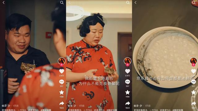 无厘头情感博主冷少则演绎了一段用舟山冰鲜带鱼等农特产挽回女朋友的爱情哲理故事,视频中,冷少虽然带上了心仪之人最爱的大闸蟹和带鱼,并且晓之以理动之以情,却依旧没有抱得美人归,以失恋告终。