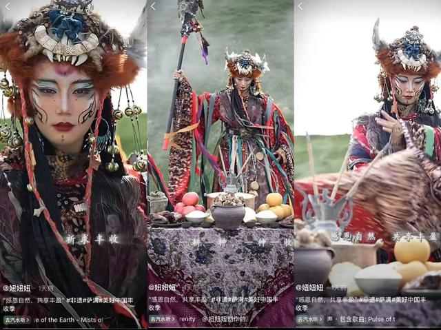 变装届头部达人妞妞妞也以变装形式变身萨满,再现了一段非遗萨满舞,通过摆满供桌的五常大米、羊脊骨等供品,向粉丝推荐来自原产地的优质农特产品。