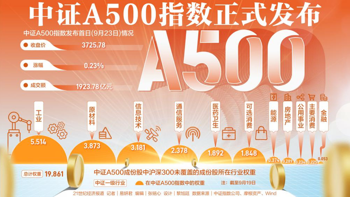 9月23日,中证A500指数正式发布。截至收盘,该指数收于3725.78点,当日上涨0.23%。